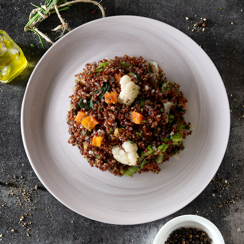 Quinoa rossa con verdure, olive verdi e erbe aromatiche