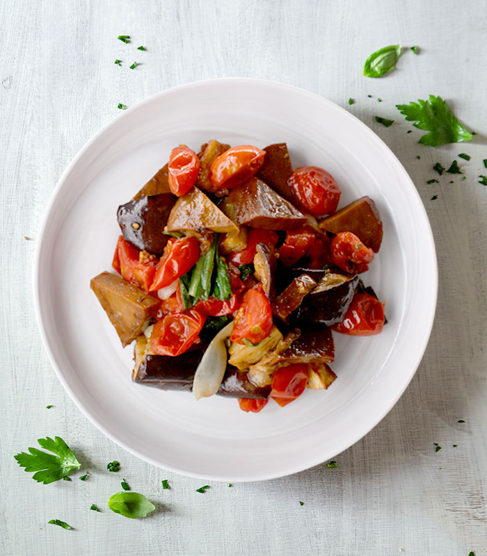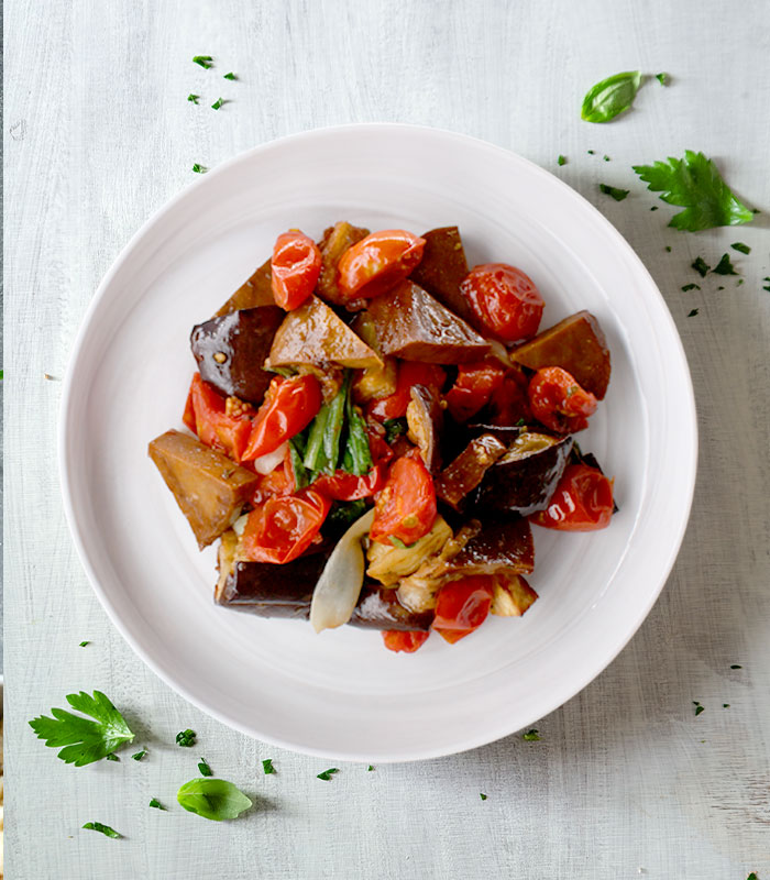 Tofù in agrodolce con pomodorini perini, cavolfiore, pinoli, uvetta, capperi, zenzero e riso basmati